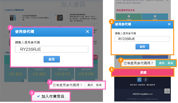 3在「您有商品券號碼嗎?」這裡點擊「是」,並輸入您的優惠券代碼,並點擊「使用」。 之後輸入會員信息,完成付款。