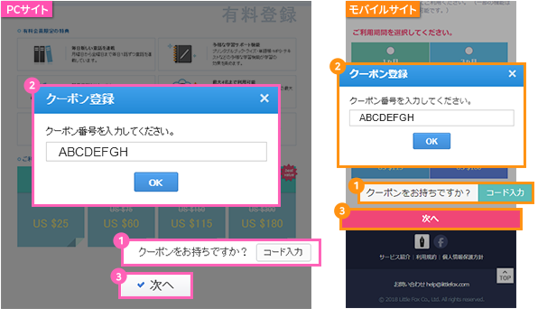 3利用期間選択ページ右下部の[はい]をクリックしてクーポンコードを半角英数字で入力してから、[次へ]をクリックしてください。必須入力項目をすべて入力して決済手続きを完了してください。